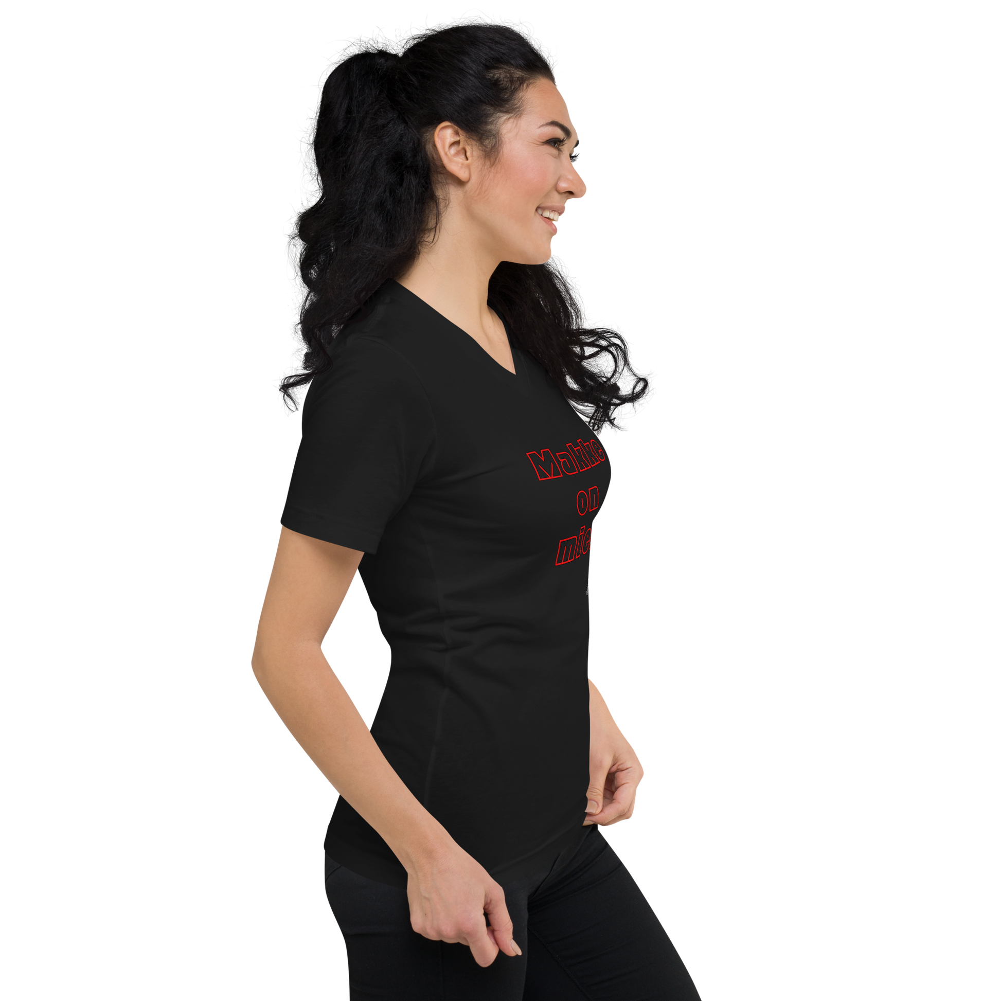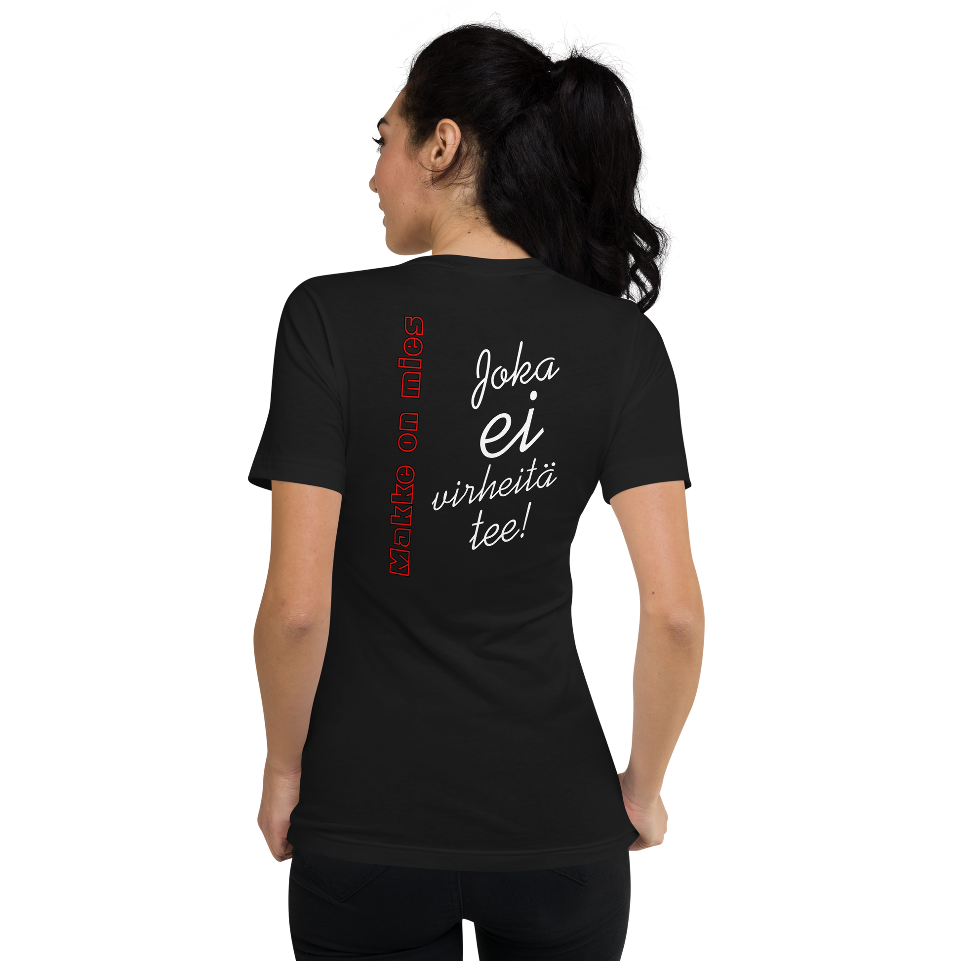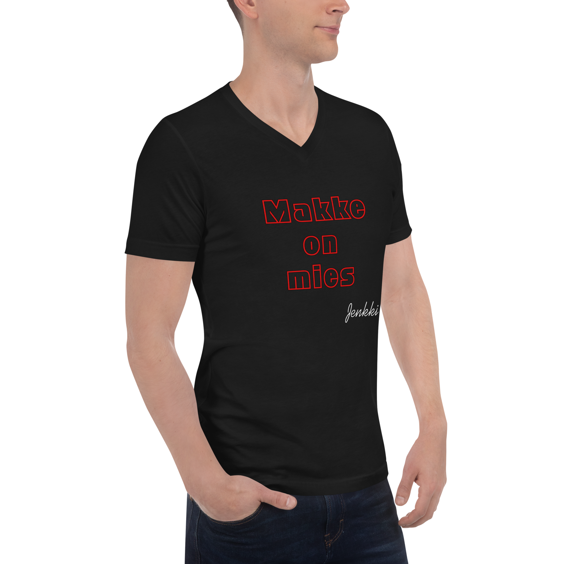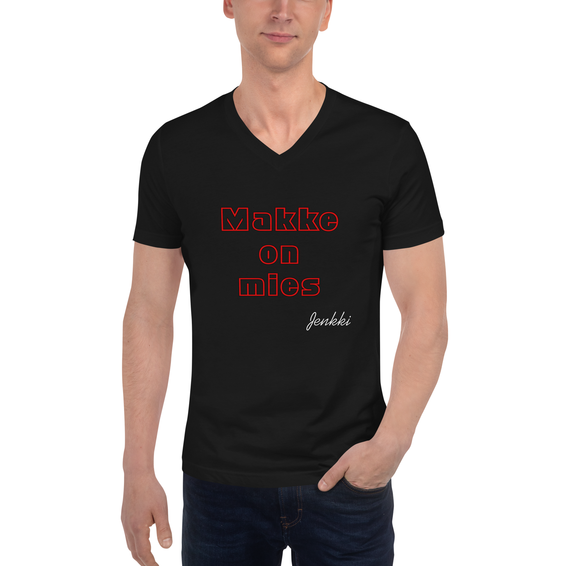 Makke On Mies T-paita, jossa V-kaulus.